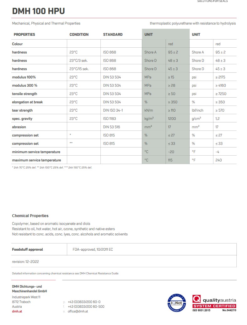 Materiał uszczelki; poliuretan DMH 100 HPU, uszczelki wykonywane przez firmę PASSEROTTI z Gdyni. Współczynnik tarcia między tym poliuretanem, a szlifowaną stalą m=0.6 (tak, bardzo duży!)