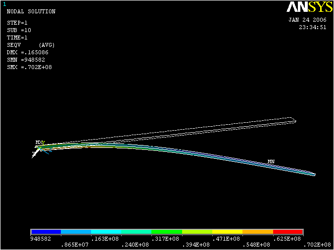 Dla dobranego cewnika 10x30x2 uzyskano maksymalne napręzęnie rzedu 70 MPa, to jest znacznie mniej od dopuszczalnego 165MPa. Jednak dla mniejszych przekrojów cewonika w sposób znaczny wzrasta strzałka ugięcia. Dlatego zdecydowałem się wybrac przekrój przy którym nie dochodzi do kompletnego wykorzystania wytrzymałości elementu.