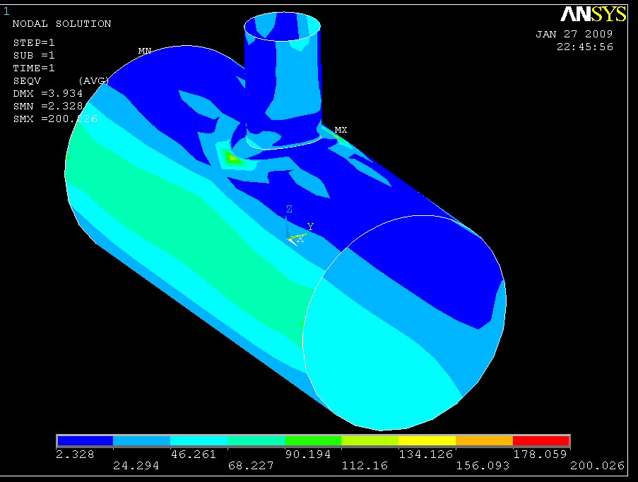 Dzieki zastosowaniu kolnierzy udalo sie zmniejszyc maksymalne naprezenia w rejonie polaczenia krócca z rura. Spowodowaly one takze rozproszenie naprezen na wiekszym obszarze, równomiernie rozkladajac je na rurze i króccu. W przypadku bez kolnierzy naprezenia skupialy sie na malej powierzchni rury.
